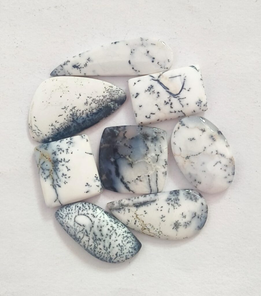 Dendrite Opal or Dendritic Agate is a unique and captivating gemstone known for its beautiful, tree-like inclusions that resemble natural landscapes. These intricate patterns, formed by mineral deposits such as manganese or iron, create stunning black or brown fern-like designs against a milky white, grey, or translucent background. Each cabochon is truly one-of-a-kind, showcasing nature’s artistic touch.